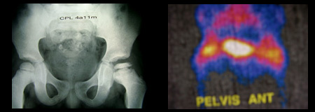 Que hace el Ortopedista Pediatra? Cuando un niño acude a la consulta por tener dolor o cojear se solicita una placa Radiográfica. En la fase de necrosis o en las siguiente, por lo general el Ortopedista Pediatra hace el diagnostico en base a placas de cadera, pero en la etapa muy inicial ( sinovitica), estas placas pueden ser normales u observarse en ocasiones datos tempranos muy sutiles de la enfermedad como es una disminución en la altura de la cabeza femoral. Cuando se tiene sospecha de la enfermedad antes de que haya cambios radiográficos es muy útil solicitar un estudio de Resonancia Magnética y de Gammagrafía Ósea. Existen otras enfermedades que puede, dar una apariencia radiográfica semejante al Perthes como es el caso de paciente con Hipotiroidismo o Displasia Epifisiaria.